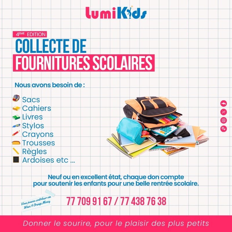 Participez à notre campagne de collecte de kits scolaires pour soutenir les élèves de l'école élémentaire de Louga ! Ensemble, offrons à ces enfants les outils nécessaires pour une rentrée scolaire réussie. Chaque don compte et peut faire la différence.