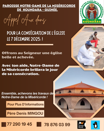 Le 7 décembre 2025 à 10h00, la communauté chrétienne de Koundara vivra un moment historique : la consécration de son église Notre-Dame de la Miséricorde. Cette maison de Dieu, fruit de tant de prières, de sacrifices et d’espérance, est déjà sortie de terre. Il ne reste que quelques travaux à achever pour qu’elle devienne un sanctuaire digne d’accueillir l’Eucharistie et d’ouvrir ses portes à tous. Aujourd’hui, nous faisons appel à votre générosité :